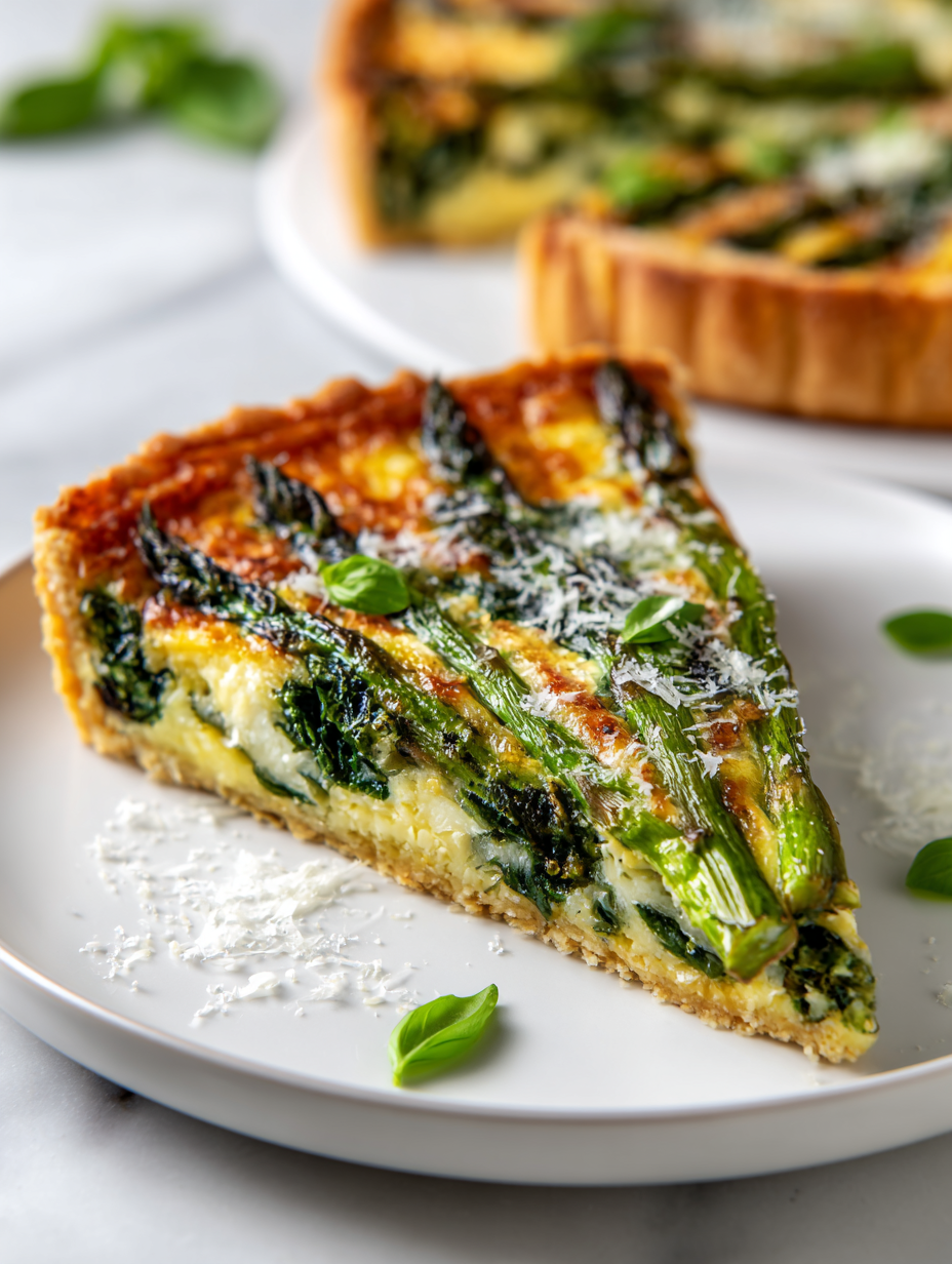 This asparagus and spinach quiche features a flaky crust filled with a silky egg custard, brightened by tender asparagus spears and wilted spinach. The dish is baked until golden and puffed, offering a satisfying combination of crisp, creamy, and tender textures that make it perfect for brunch, lunch, or a light dinner.