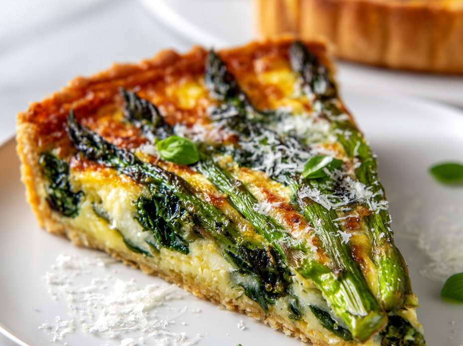This asparagus and spinach quiche features a flaky crust filled with a silky egg custard, brightened by tender asparagus spears and wilted spinach. The dish is baked until golden and puffed, offering a satisfying combination of crisp, creamy, and tender textures that make it perfect for brunch, lunch, or a light dinner.