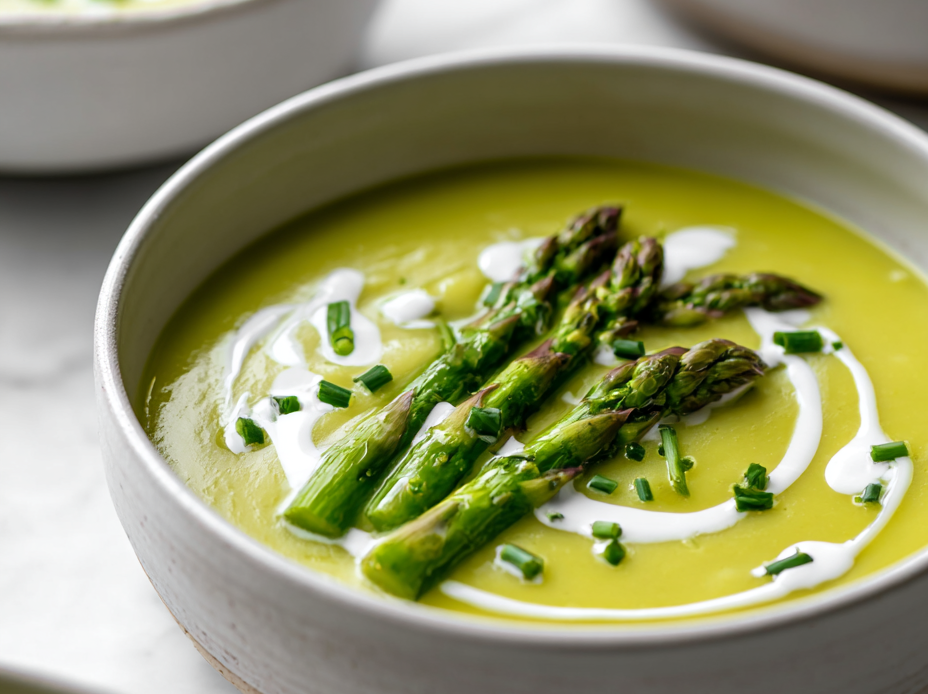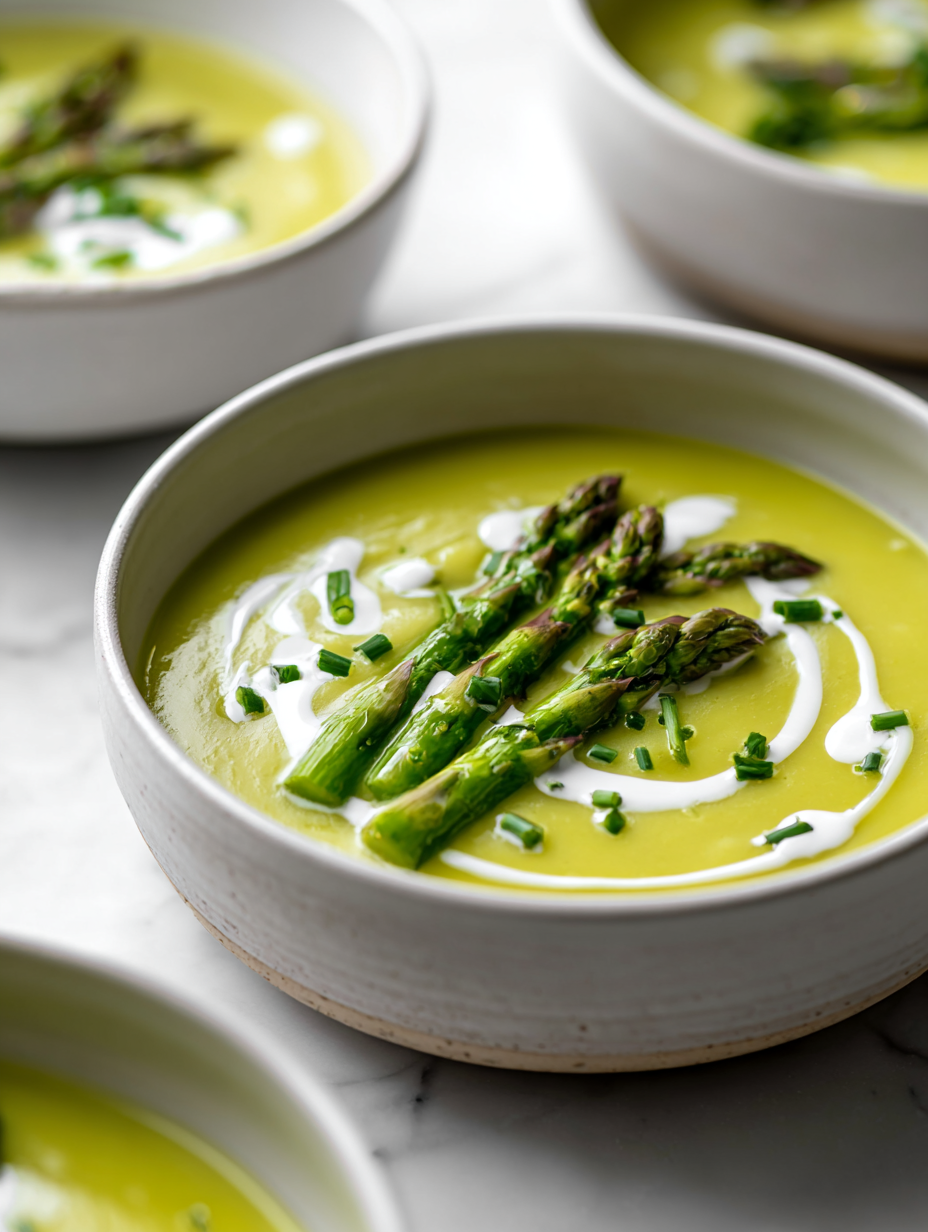 Focusing on how the contrasting textures and flavors of tender asparagus and creamy potatoes create a comforting, yet unexpectedly lively soup that celebrates spring’s fleeting freshness.