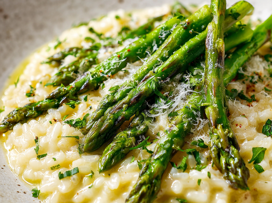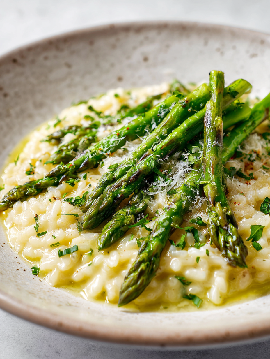 - Serve immediately, garnished with a little extra Parmesan and a squeeze of lemon if desired. The risotto should be velvety, with a gentle sheen, and the asparagus bright and tender.
