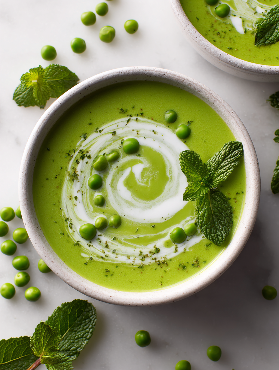 Focusing on the unexpected pairing of fresh mint with creamy peas, highlighting how the herb brightens the soup’s sweetness and transforms a simple spring ingredient into a sophisticated dish.