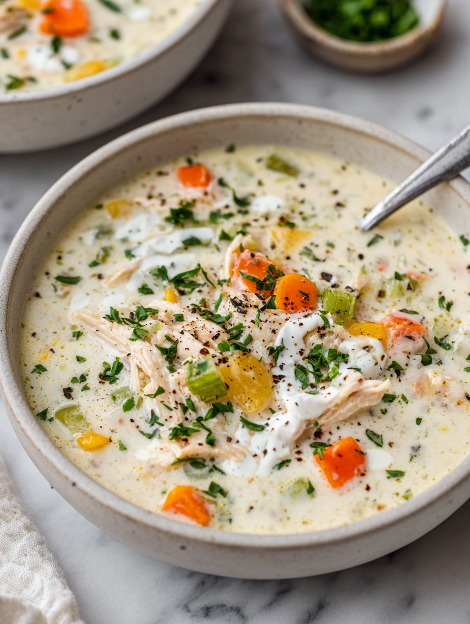 This creamy chicken soup isn’t just a quick fix, it’s a small ritual that makes busy evenings feel a bit more manageable. The warm aroma of tender chicken and velvety broth fills the kitchen with a sense of quiet accomplishment. It’s perfect for those moments when you need comfort without complexity.