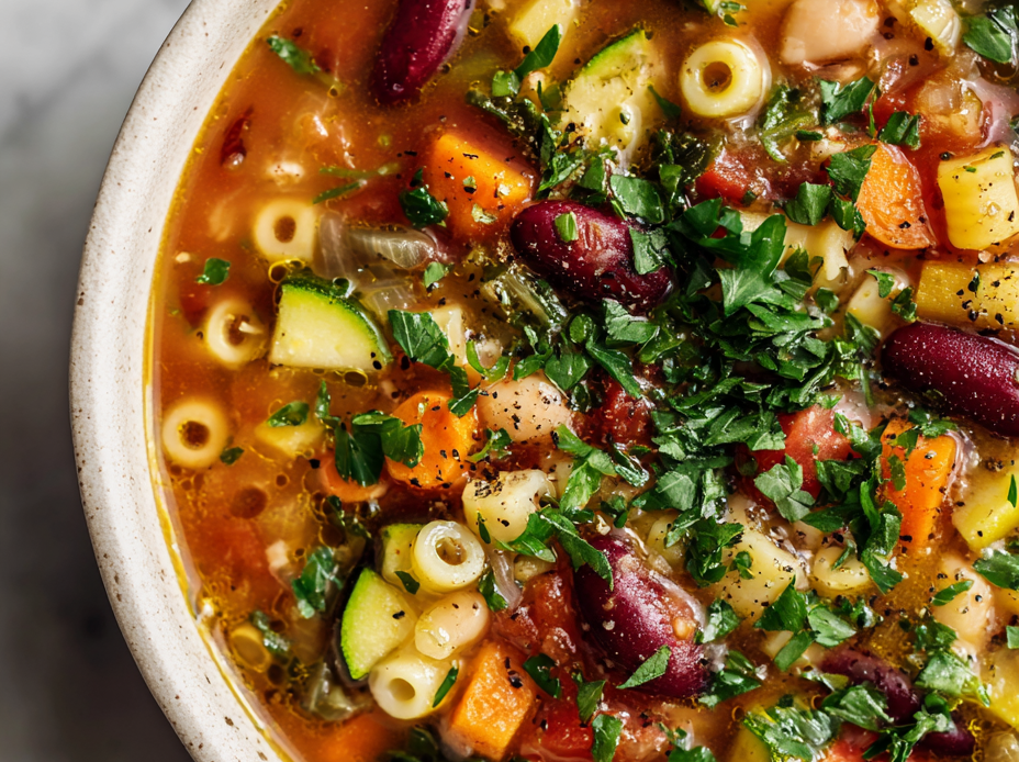 - Serve the minestrone hot, garnished with a drizzle of olive oil or a sprinkle of Parmesan if desired. Enjoy this comforting, hearty bowl that tastes like it’s been simmering all day.