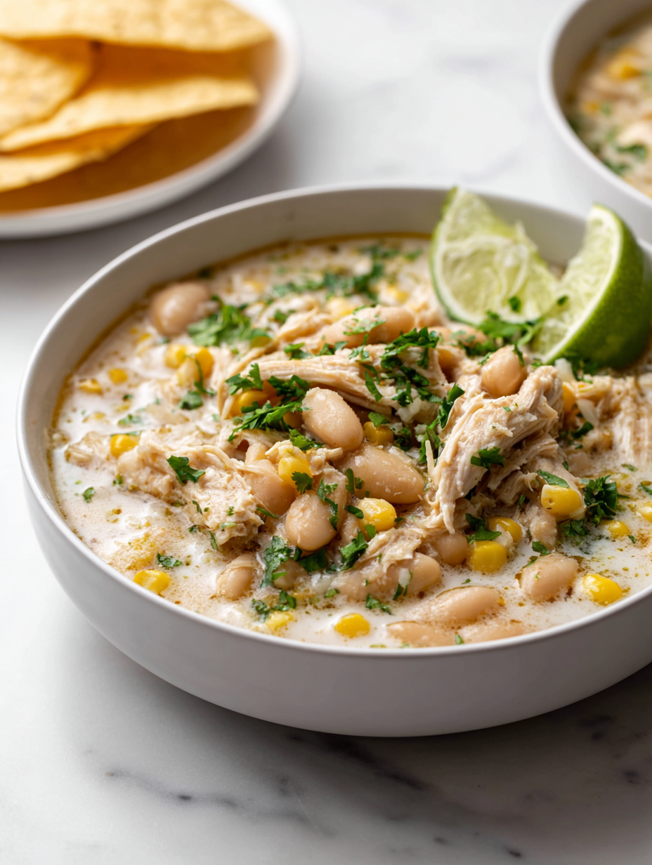 This creamy white chicken chili is made in the slow cooker, combining tender shredded chicken, white beans, and smoky green chilies in a flavorful broth infused with cumin and garlic. Finished with cream cheese and a splash of lime, it offers a comforting, mildly spicy texture with a velvety appearance, perfect for cozy nights.