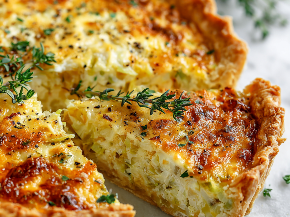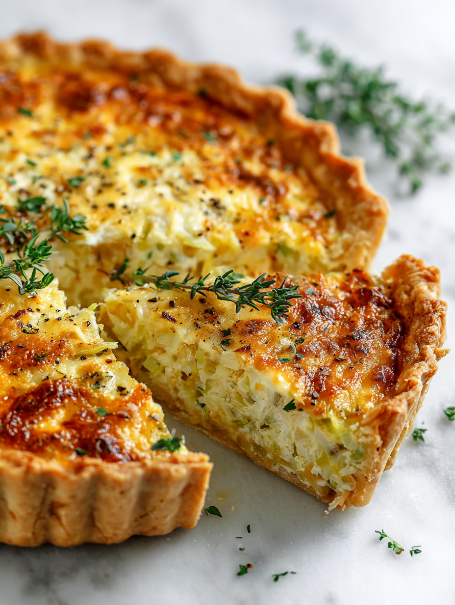 This leek and cheese quiche features a flaky crust filled with a creamy custard loaded with caramelized leeks and sharp cheddar cheese. The slow-cooked leeks develop a sweet, smoky flavor that balances the richness of the custard, resulting in a tender, golden-brown dish with a crisp crust and velvety filling.