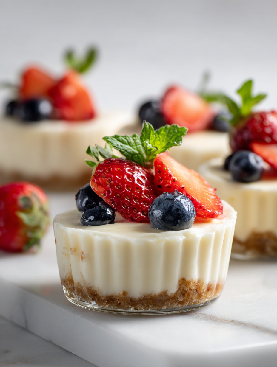 Let the cheesecakes rest in the fridge for at least 2 hours to set. Finish with toppings just before serving to keep them fresh and vibrant. Serve chilled, directly from the fridge for the best texture and flavor.