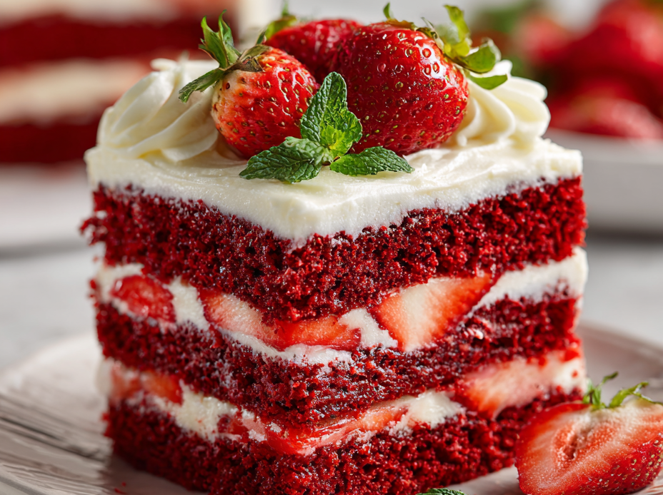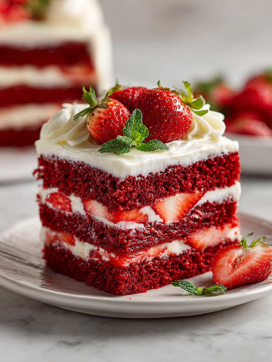 Focusing on how the vibrant red of the velvet cake contrasts beautifully with the bright, juicy strawberries, this cake becomes a celebration of color and freshness, perfect for spring gatherings or when you want a dessert that looks as lively as it tastes.