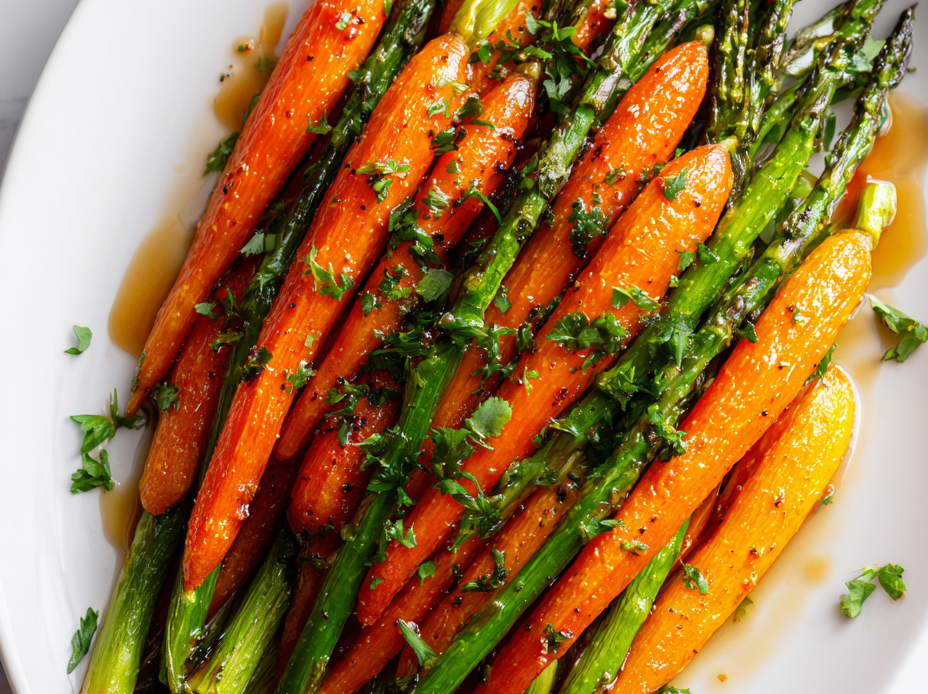 - Carrots are deeply amber with caramelized edges, asparagus is crisp-tender and slightly charred.