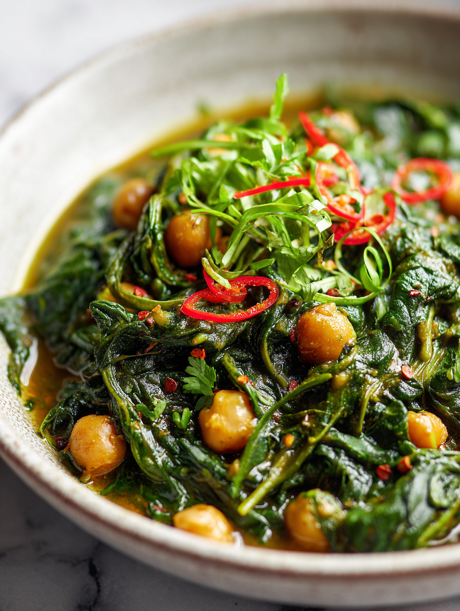 This quick and hearty spinach and chickpea curry is made with simple ingredients like spinach, chickpeas, and spices, cooked using sautéing and simmering methods. The dish features tender wilted spinach in a flavorful tomato-based sauce, resulting in a comforting, vibrant green bowl with a rich, slightly thickened texture. Perfect for busy weeknights, it offers a nourishing hug in every bite.