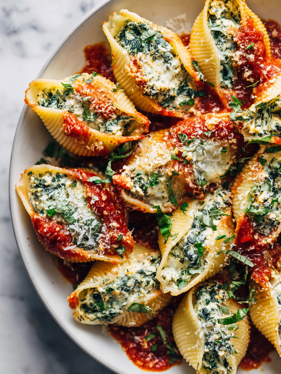 10. Serve the shells warm, enjoying the tender pasta filled with creamy, flavorful spinach and topped with melted cheese. Dig in and savor each comforting bite!