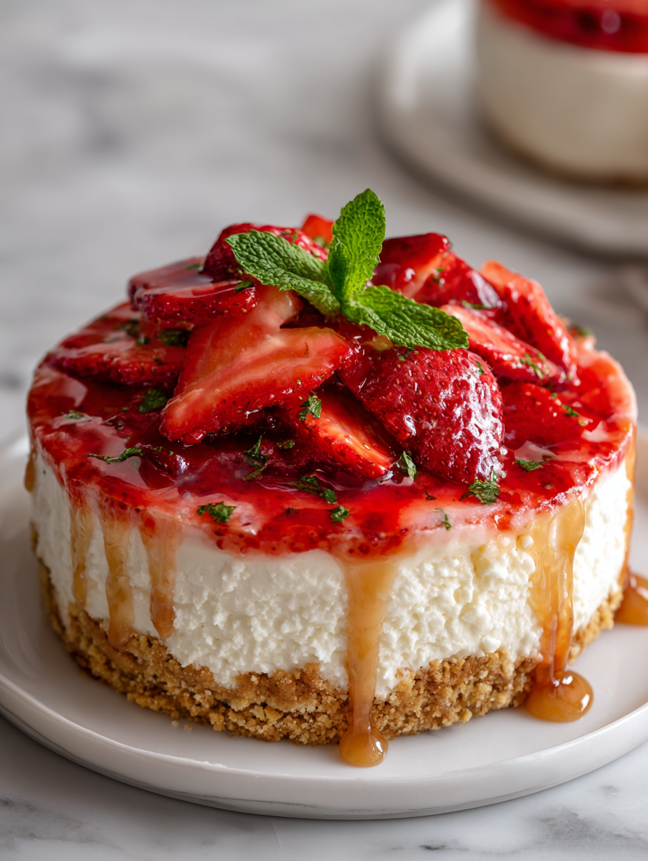 - Spread the macerated strawberries and their juices over the chilled cheesecake, creating a glossy, vibrant topping.