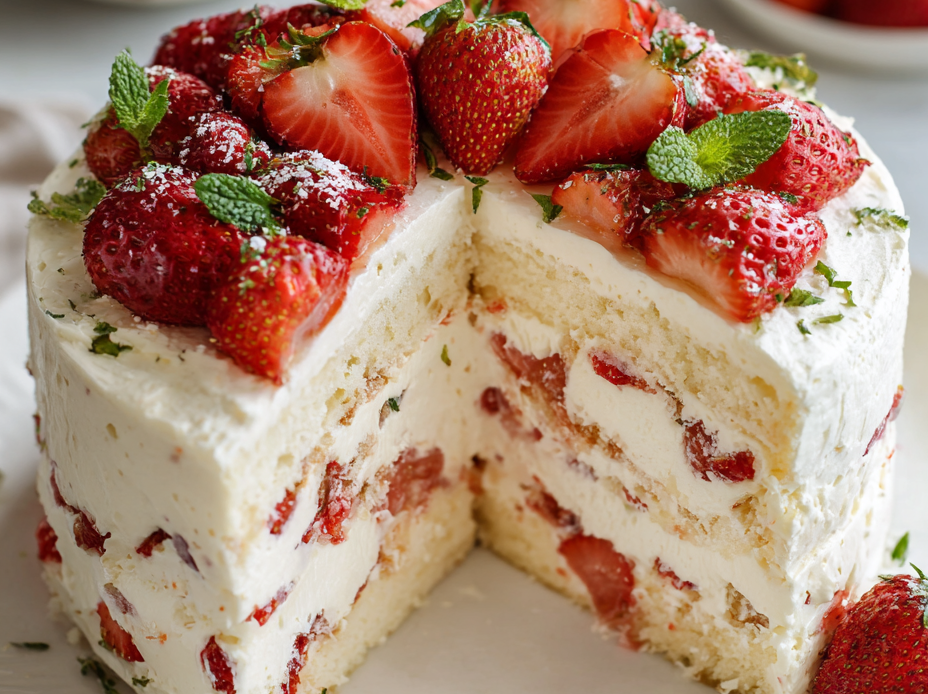 - Arrange the remaining strawberries on top, pressing them gently into the filling for a natural look. Place the cake in the fridge for at least 4 hours, preferably overnight, to set fully.