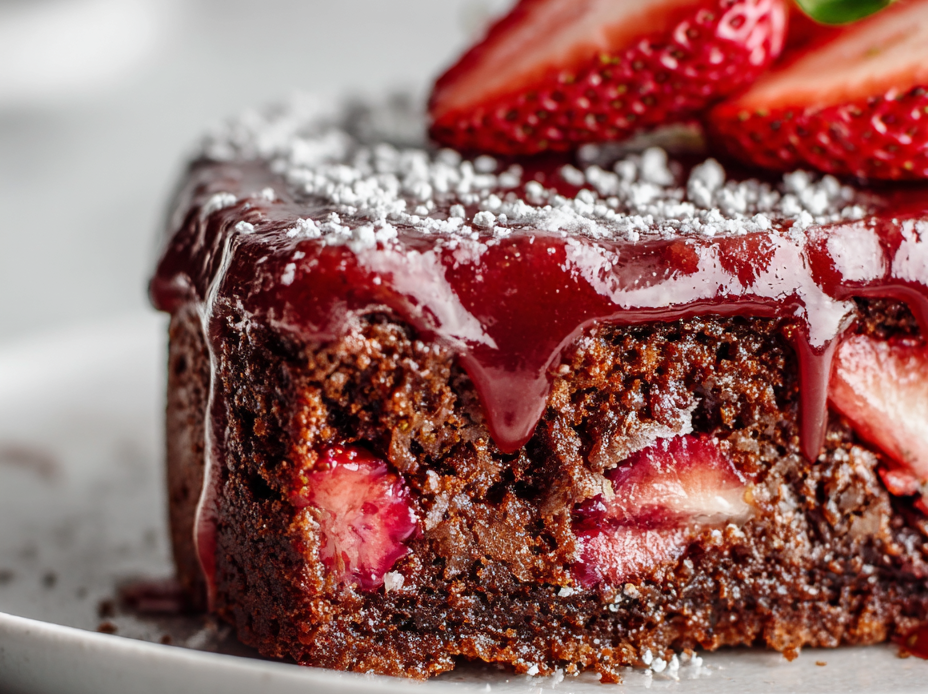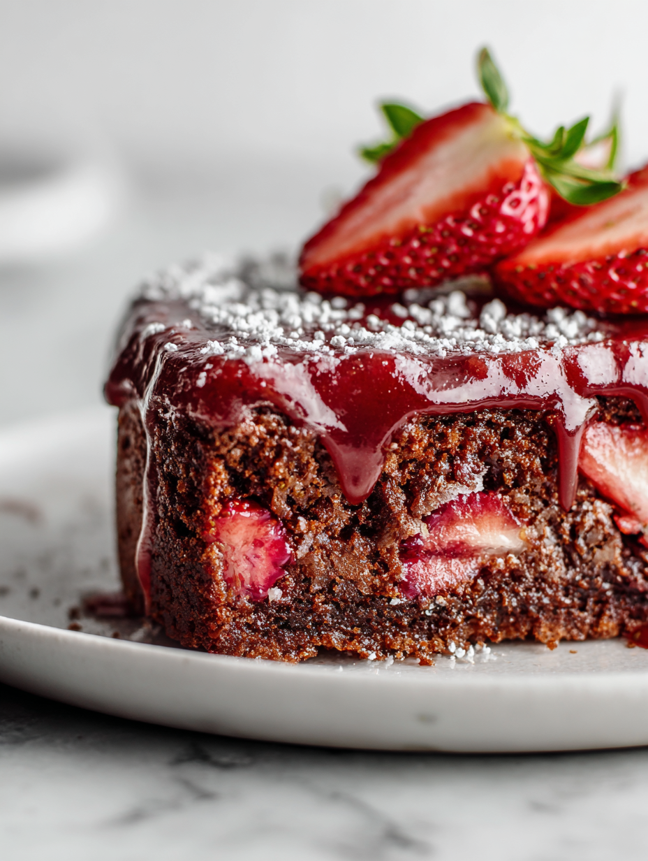 12. Slice and serve the cake warm or at room temperature. For an extra touch, dust with powdered sugar or garnish with additional strawberries. Enjoy the rich, fruity, and gooey goodness!