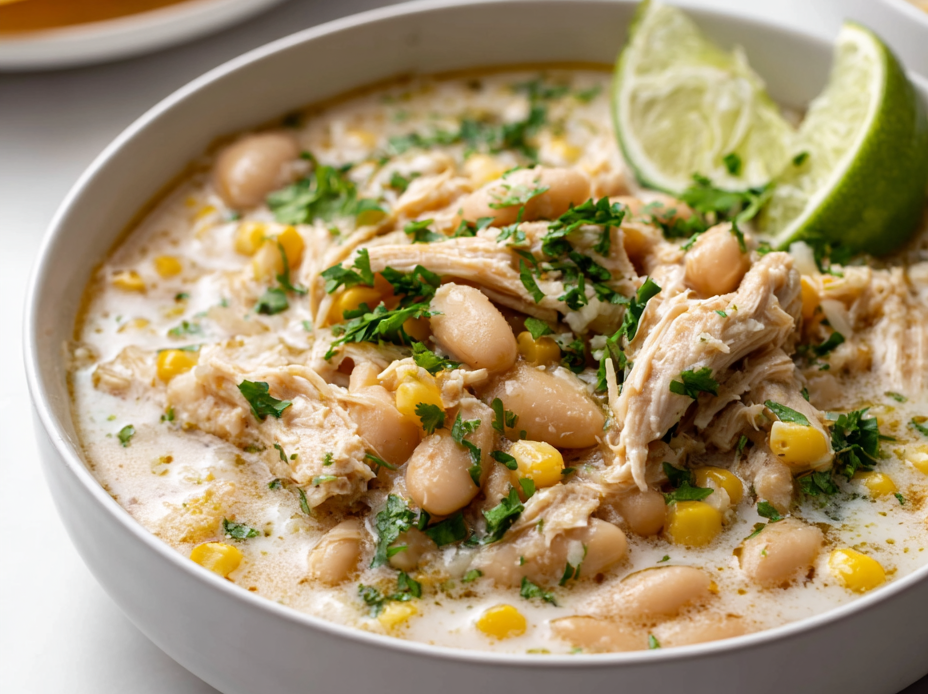 This creamy white chicken chili is made in the slow cooker, combining tender shredded chicken, white beans, and smoky green chilies in a flavorful broth infused with cumin and garlic. Finished with cream cheese and a splash of lime, it offers a comforting, mildly spicy texture with a velvety appearance, perfect for cozy nights.