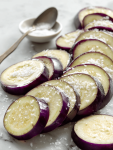 Step 2: Slice eggplants into 1 cm (0.4 inch) rounds, then salt them generously. Let sit for 20 minutes to draw out moisture.