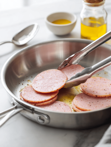 3. Cook the bologna for about 2-3 minutes on one side, until edges turn crispy and golden brown.