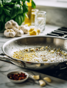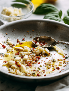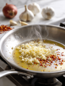 3. Add the finely chopped garlic and chili flakes to the skillet, sautéing for about 30 seconds until the garlic is just golden and aromatic, being careful not to burn it.