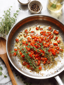Step 5: Toss in a handful of cherry tomatoes, cook until they burst and release their juices, about 3-4 minutes, stirring occasionally.