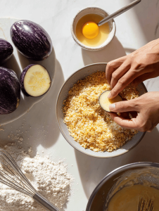 4. Dip each eggplant slice into the beaten eggs, ensuring it’s coated evenly—this helps the breadcrumbs stick.