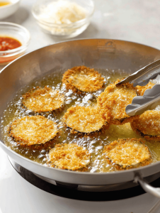 7. Fry the breaded eggplant slices in the hot oil, about 3 minutes per side, until golden brown and crispy. Flip carefully and cook until both sides are crisp.