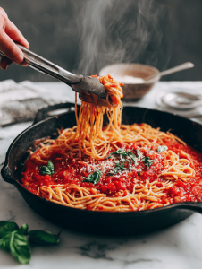 5. Gently toss the drained pasta into the skillet with the tomato mixture, adding a splash of the reserved pasta water to loosen the sauce and help it cling to the pasta.