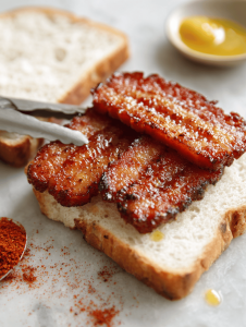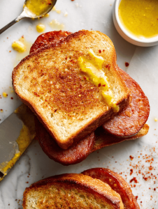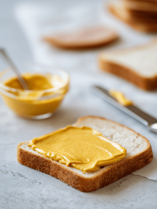 7. Spread mustard or hot sauce on one side of each toasted bread slice for a bright, tangy flavor.