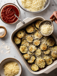 10. Layer fried eggplant slices in the dish, spreading marinara sauce and sprinkling shredded mozzarella and Parmesan between layers.
