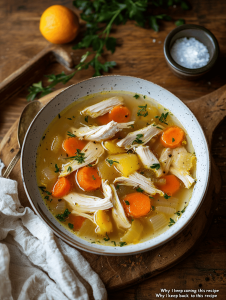 This winter chicken soup is made by slow-simmering bone-in chicken thighs with fresh vegetables and herbs, resulting in a fragrant, deeply flavored broth. The tender chicken falls apart easily, and the vibrant herbs and lemon brighten the rich, clear soup with a comforting, homey texture. It’s a soulful dish perfect for cozy evenings, with a balance of savory and bright flavors.