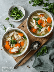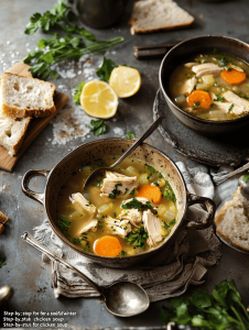 This slow-simmered chicken soup features tender chicken, aromatic vegetables, and fragrant herbs, resulting in a rich, clear broth with fall-apart meat. The dish highlights the gentle extraction of flavors through a long, gentle cook, culminating in a comforting, bowl-worthy meal with a bright citrus finish.