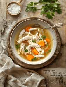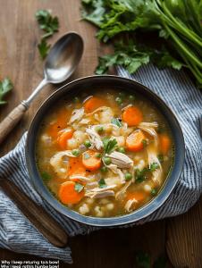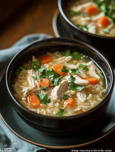 - Enjoy the comforting warmth of this hearty chicken soup, with tender shredded meat and a bright, flavorful broth.