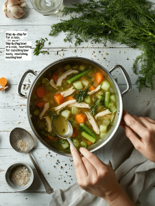 Step 4: Add herbs like thyme and bay leaves, then cover partially. Let it simmer quietly for at least an hour, stirring occasionally, until the chicken is falling apart and the broth is deeply flavored.